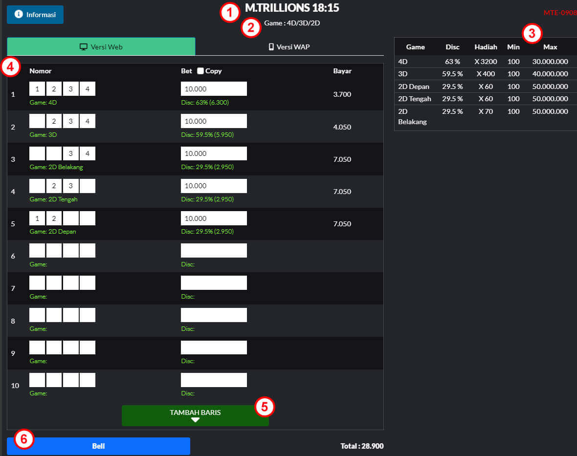 Taruhan pemain yaitu : 4D = 1234 sebesar Rp 10.000. Setelah discount, saldo yang terpotong hanyalah Rp 3.700